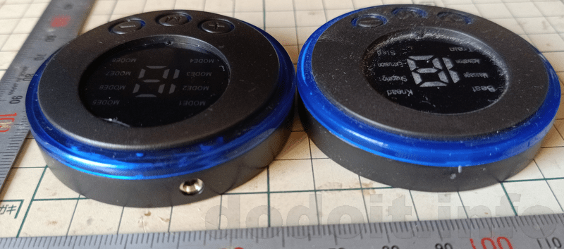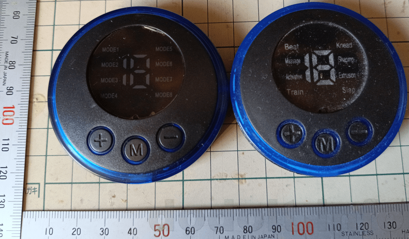 左が今回の、右が『EMS Foot Massager』のコントローラーなのですが、サイズ感は同じなのに、あらゆるところがちょっとずつ違いますよね。不思議。