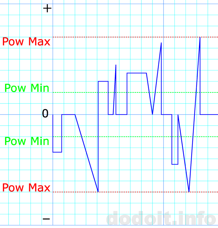 ・Pow=m-n(0-100) モーターを回転させる出力を範囲指定します。このパラメタはこのままDGCに渡され、DGC側でモーターをオンにするタイミングが訪れるたびにこの範囲内で毎回ランダムに出力を決定します。